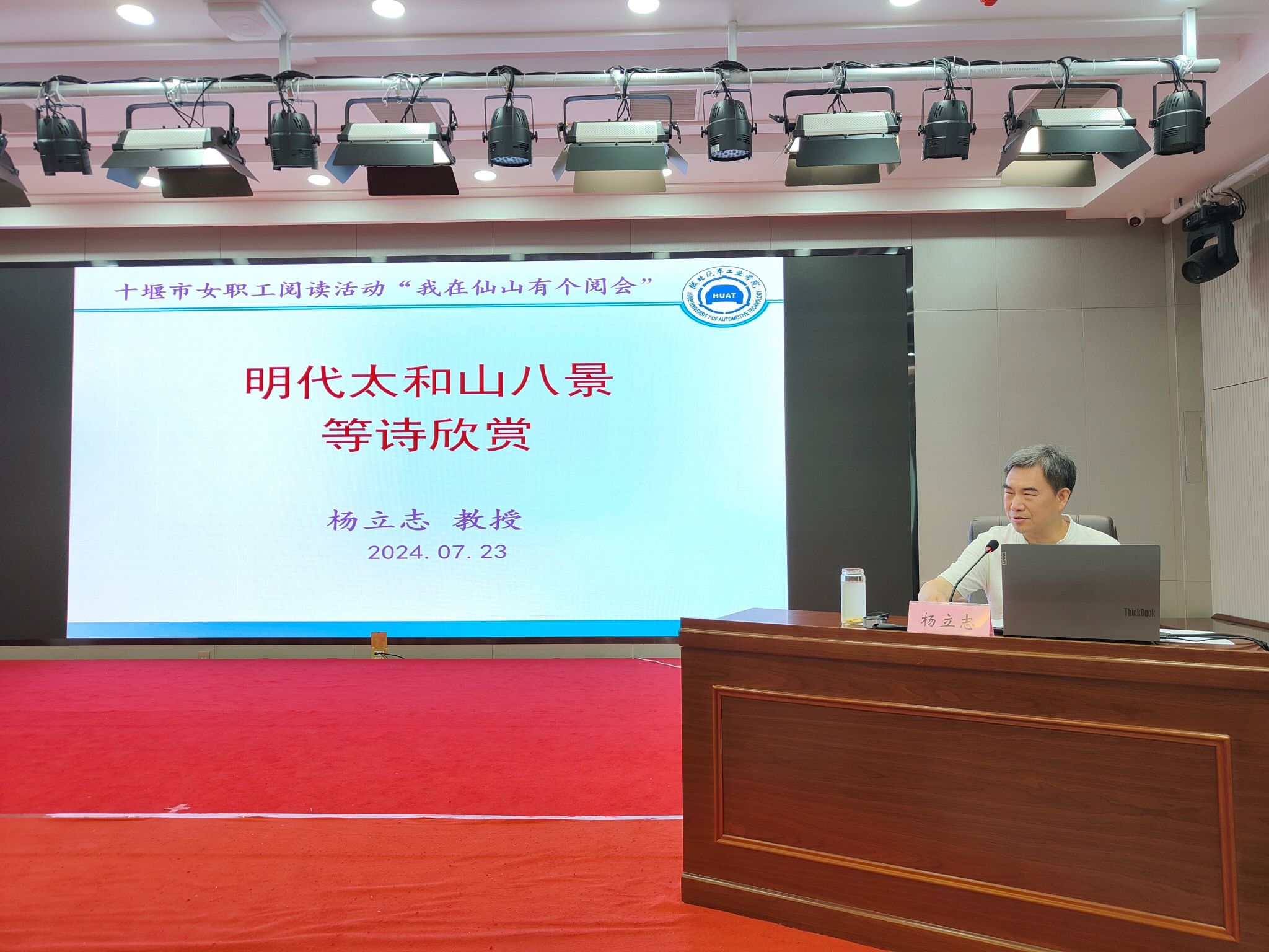 2024年7月23日,“玫瑰书香 阅美十堰”女职工主题阅读示范活动在十堰市工人文化宫举行,公司人文公司教授、湖北省人文社科重点研究基地武当文化研究与传播中心主任杨立志老师受十堰市总工会与伟德BV1946官网校工会邀请,做题为《明代太和山八景等诗欣赏》的讲座。该活动由十堰市总工会女职工委员会主办,十堰市总工会党组书记、常务副主席凌燕,市总工会党组成员、副主席吴海燕,市总工会党组成员、副主席杨东芳等出席活动。