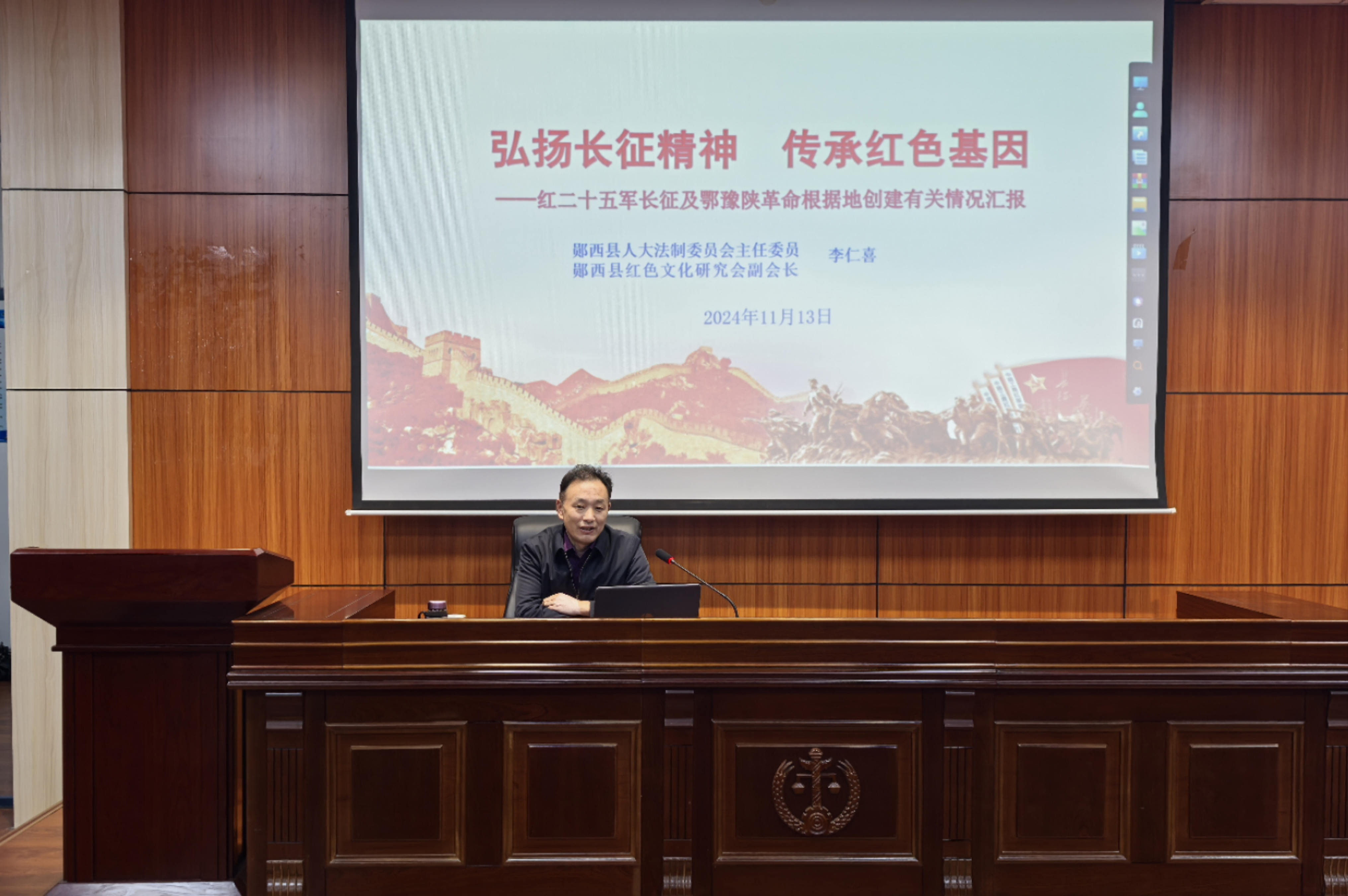李仁喜以“过法考,人生半程翩翩而行”为题,给员工分享了自己在51岁时备战8个月通过司法考试的经历和收获,激励法学学子们要做到目标既定,付诸实施;基础扎牢,细心领会;跟上节奏,步步为营;坚持下去,不要放弃,实现人生学法的价值。随后,李仁喜又做了题为“弘扬长征精神 传承红色基因——红二十五军长征及鄂豫陕革命根据地创建有关情况汇报”的讲座。