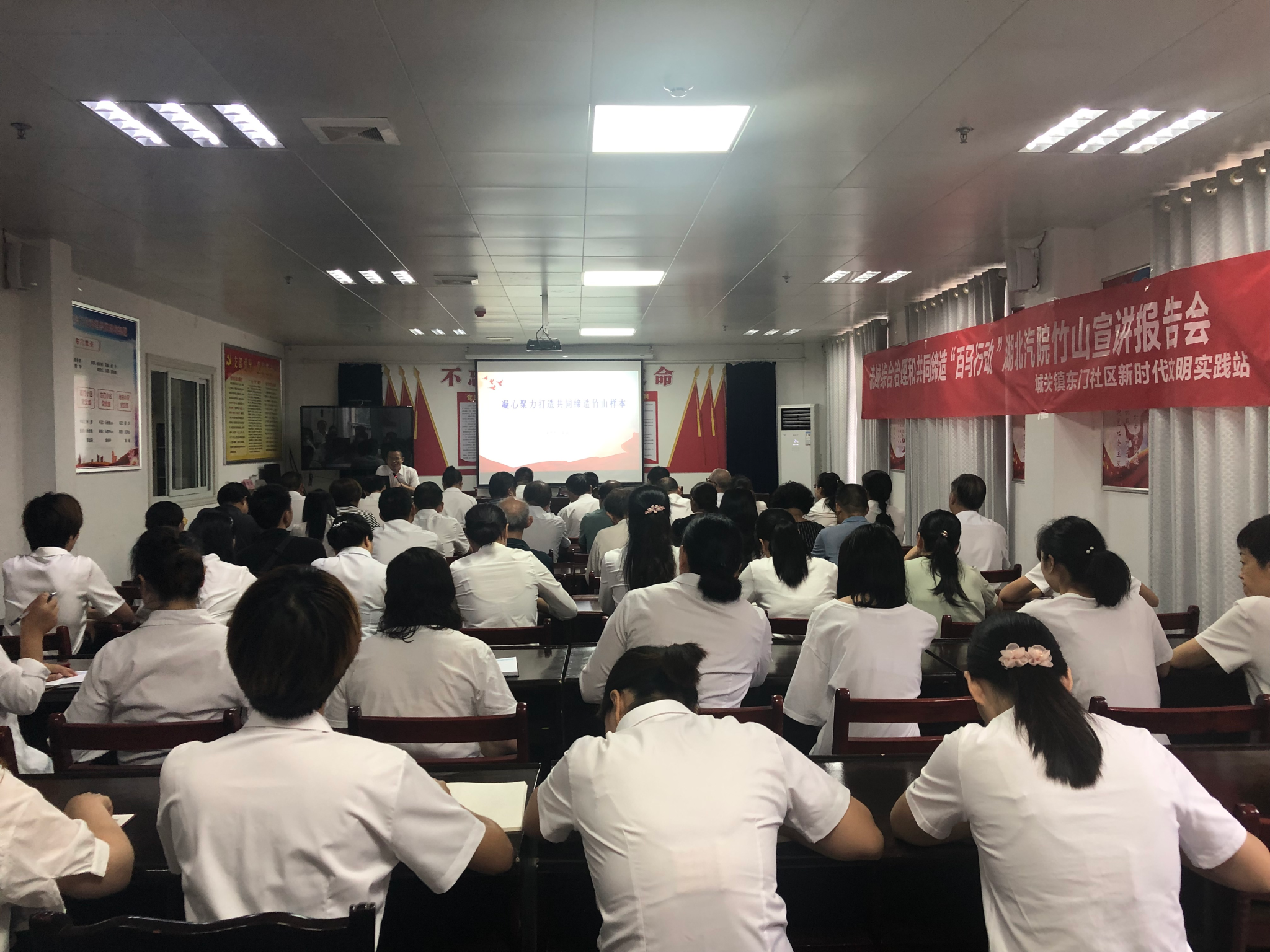 在竹山县城关镇共同缔造试点东门社区,伟德BV1946官网经理黄永昌以《凝心聚力打造共同缔造竹山样本》为题,结合竹山本地优秀精神文明实践,并围绕“紧扣政策文件,上接天线,彰显政治高度”“跟踪学术前沿,经世致用,突出理论热度”“把握社情民意,有的放矢,突出实践温度”“学习先进做法,他山之石,体现借鉴效度”“汲取传统智慧,知古鉴今,提升文化厚度”“探索特色亮点,活学活用,增加工作力度”六个方面展开宣讲。