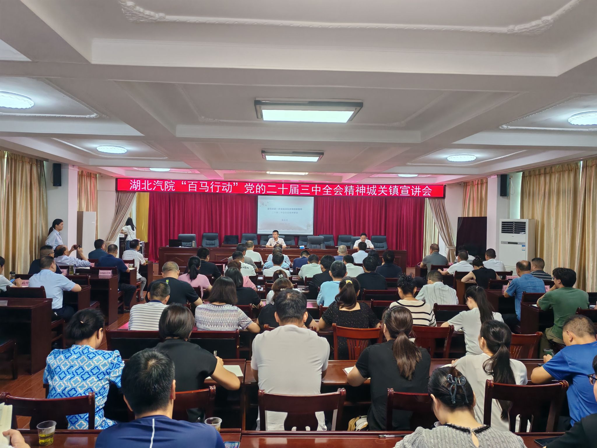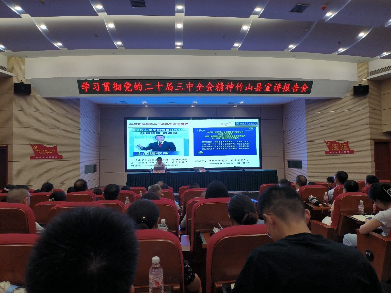 在竹山县新时代文明实践中心会场,伟德BV1946官网分党委书记计毅波教授以《以进一步全面深化改革开辟中国式现代化广阔前景》为主题,从全会的基本情况和主要成果、深刻认识党的二十届三中全会的重大意义和总体要求、准确把握重要改革部署和举措、提升党的领导水平和认真学习贯彻落实全会精神五个方面,对党的二十届三中全会精神进行了深入论述,县直单位100余名干部职工参会。